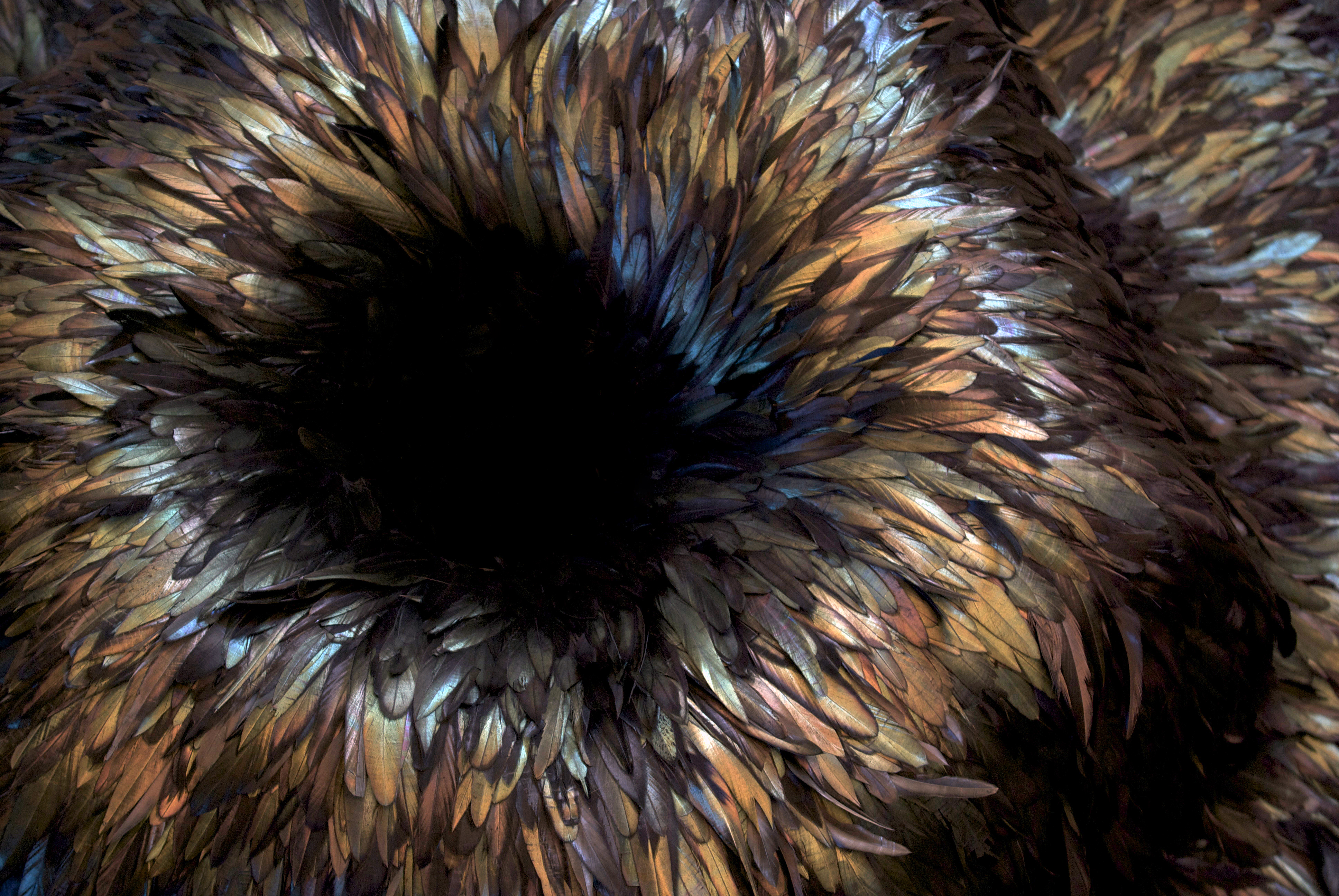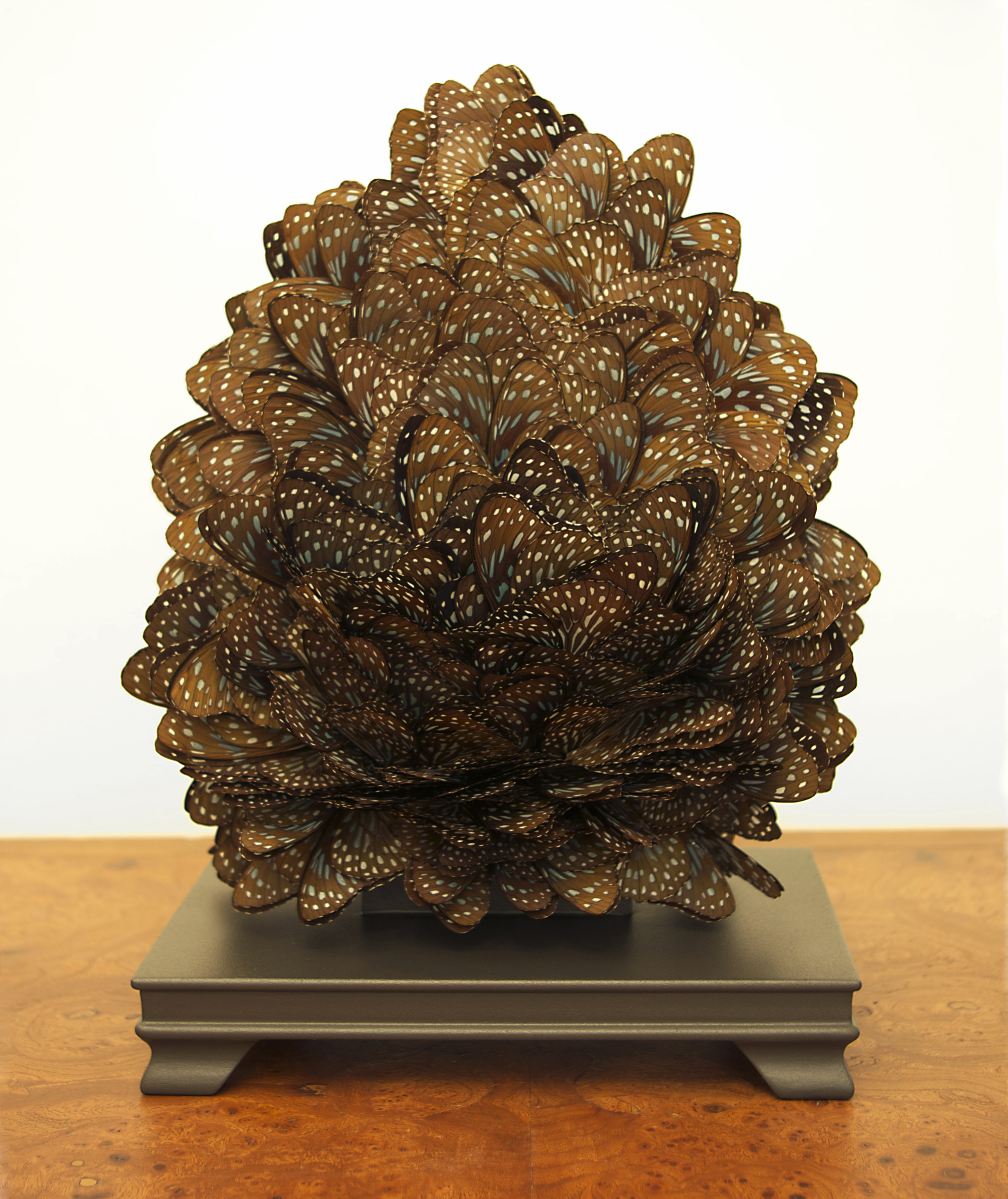 Hembrey’s voluminous sculpture made from feathers, Font (2013), captures how I would imagine silence would feel if I were able to touch it. I imagine a calmness of sinking onto or into his feathery sculpture where all else around or inside me rests. I envision a stray feather, shed unawares from a bird flying past, floating down from the sky (in the case of Hembrey’s Font, a mass of feathers from a passing flock). Hush (2013), a smaller sculpture made from hundreds of butterfly wings, withholds the silent sound of fluttering butterfly wings. In form resembling a Chinese scholar stone, an image to inspire dream-like contemplation.